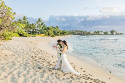 After their Hawaiian-infused and romantic ceremony, Alyissa and Cody shared newlywed portraits on the beach! Their joy was palpable as they posed under the palm trees with their family and friends by their side. Alyissa looked radiant in her gown, while Cody exuded charm and elegance in his attire. Their joy was palpable, and the atmosphere was filled with peace and serenity!